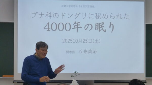 樹木医 石井誠治さん(22回社会)をお迎えして「4000年の眠りから覚めた縄文ドングリ」をテーマに樹木と人間の関わりについて幅広くお話しいただきました。あわせて、近年社会問題となっているクマ出没の背景や、季節の樹木の観察についても解説をいただきました。
