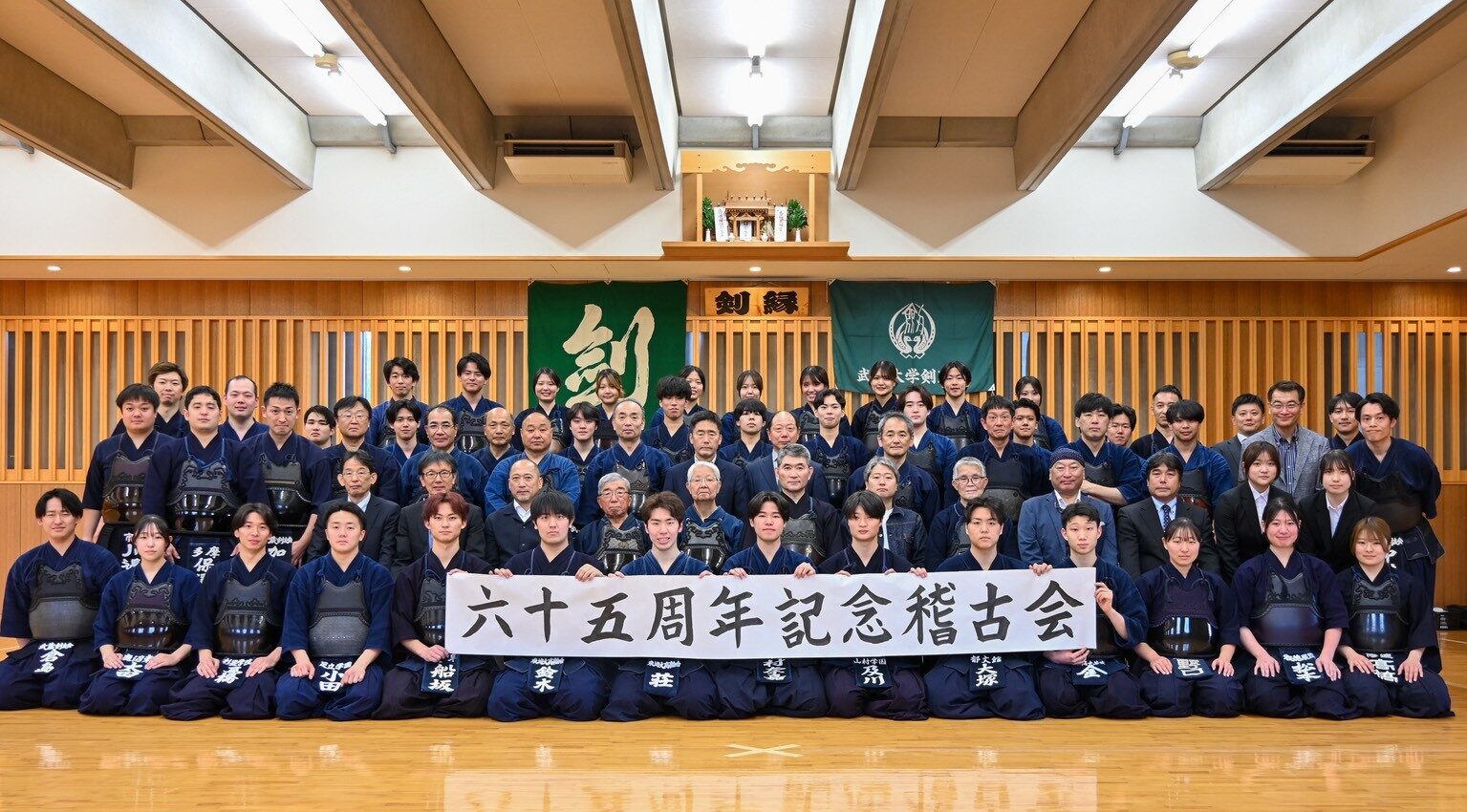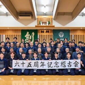当日は10時から大学体育館にて記念稽古会を行いました。大学側からは新原将義剣道部部長にもご出席いただきました。昭和39年卒の小池幸夫先輩を筆頭に、手塚哲夫先輩(昭和42年卒)、関根剛先輩(昭和50年卒)といった大先輩も率先して稽古に参加され、現役OB合わせて約60名が剣を交えました。交剣知愛の精神のもと、まず剣によって互いの心を通わせ合うことができ、15時からの懇親会に繋がる清々しい稽古会となりました。